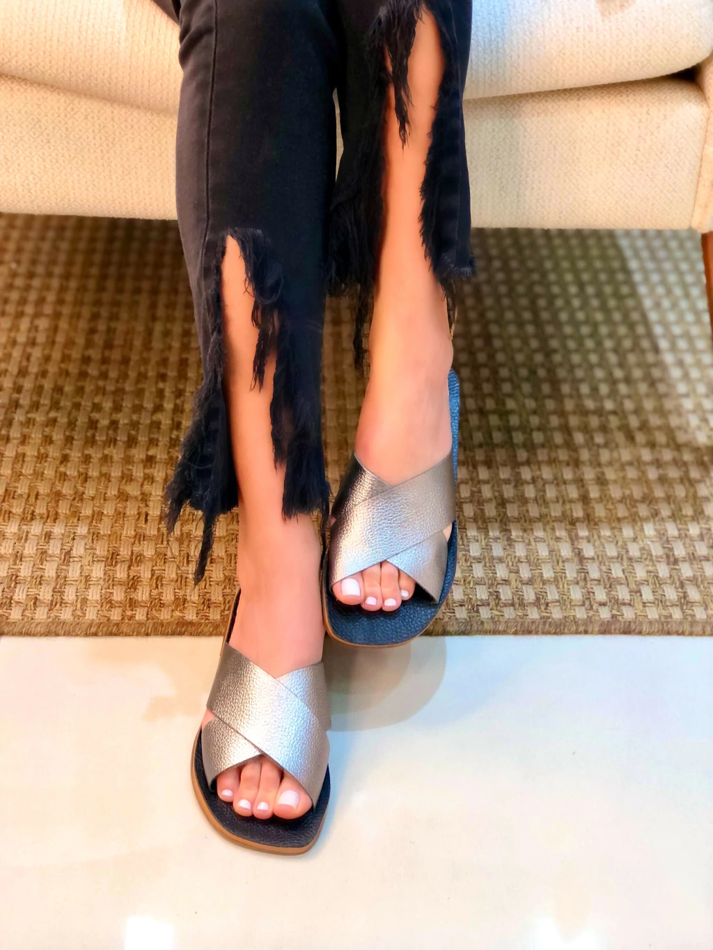 Transforme seu guarda-roupa e sinta-se radiante com a Rasteira Metalizada em Couro Prata Velho!